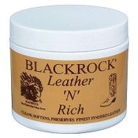 Blackrock is more of a wax than a polish, and although it does give a glow, it also adds moisture to leather and makes it more supple. It has to be used sparingly in order to avoid stickiness. If it does get tacky, Blackrock is water and oil soluble, so simply wash or oil the saddle to remove any excess. We recommend that you fill the empty space in the container with water and shake well to mix. Blackrock can be mixed as much as 50/50 with water to dress leather. We do not apply it directly to leather, but dip out about 1/2 of a teaspoon and spread onto the palm of our hands and then rub into the leather. When applying to heavy floral toolings, we recommend that you dip a small fingernail brush into the mixture and press it into the tooling. After applying Blackrock, wipe the leather with a paper towel to remove any excess. NOTE: DO NOT use on suede or rough-out leather.